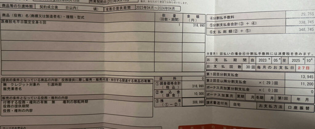 私は湘南美容クリニック仙台院で、総額348,745円(分割手数料込)をかけて全身脱毛6回を契約しました。